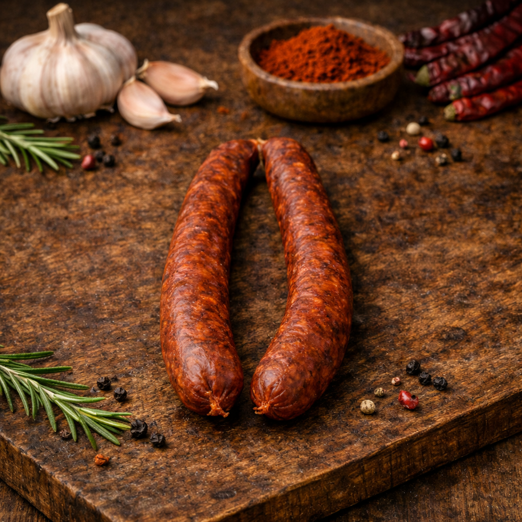 Enyhe, harmonikus fűszerezésű, bükkfán füstölt mangalica csemegekolbász.