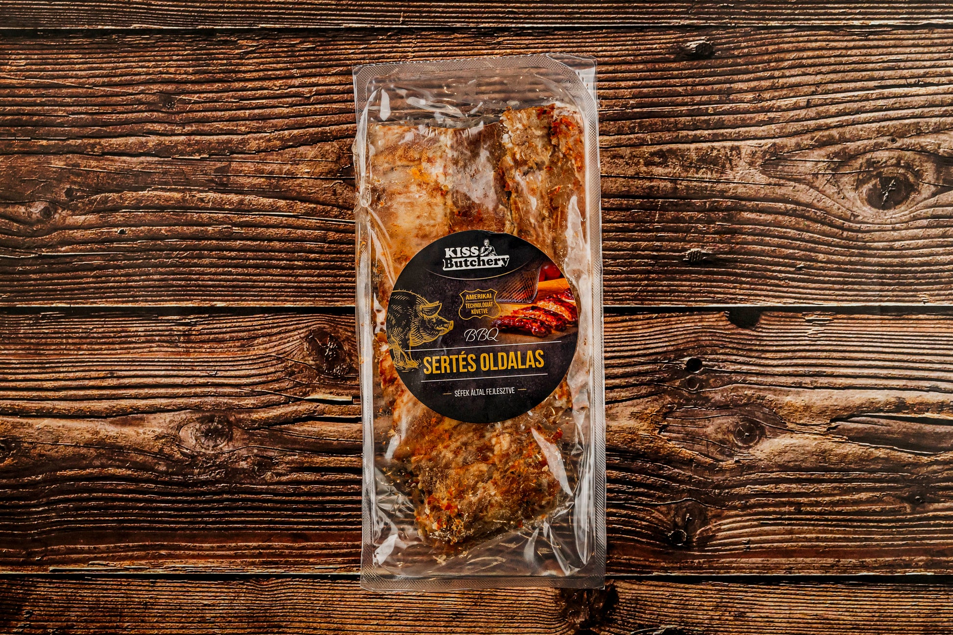 Sertés csontos oldalas, étkezési só, cukor, BBQ szósz, fűszerek.